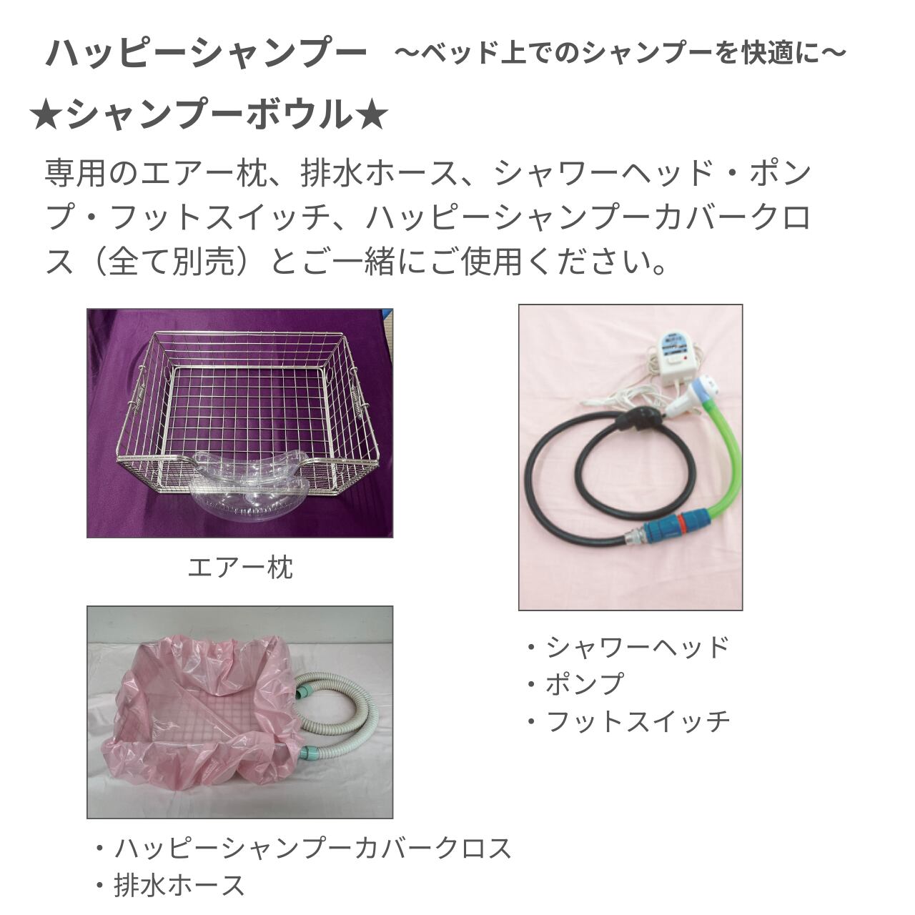 使用の際は、専用のエアー枕、排水ホース、シャワーヘッド・ポンプ・フットスイッチ、ハッピーシャンプーカバークロス(全て別売)と一緒にご使用ください。